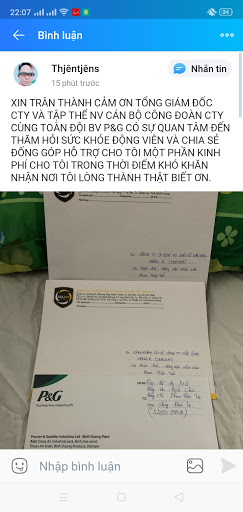 Thay mặt nhân viên Phạm Thiện Tiến cùng Ban Giám Đốc Công ty, xin chân thành cảm ơn tấm lòng nhân ái của các anh em, đồng đội tại nhà máy P&G Đồng An; thay mặt tập thể nhân viên xin cảm ơn Ban Giám Đốc công ty đã động viên, hỗ trợ kịp thời để anh em nhân viên có thêm sức mạnh để vượt qua hoàn cảnh khó khăn, bệnh tật.